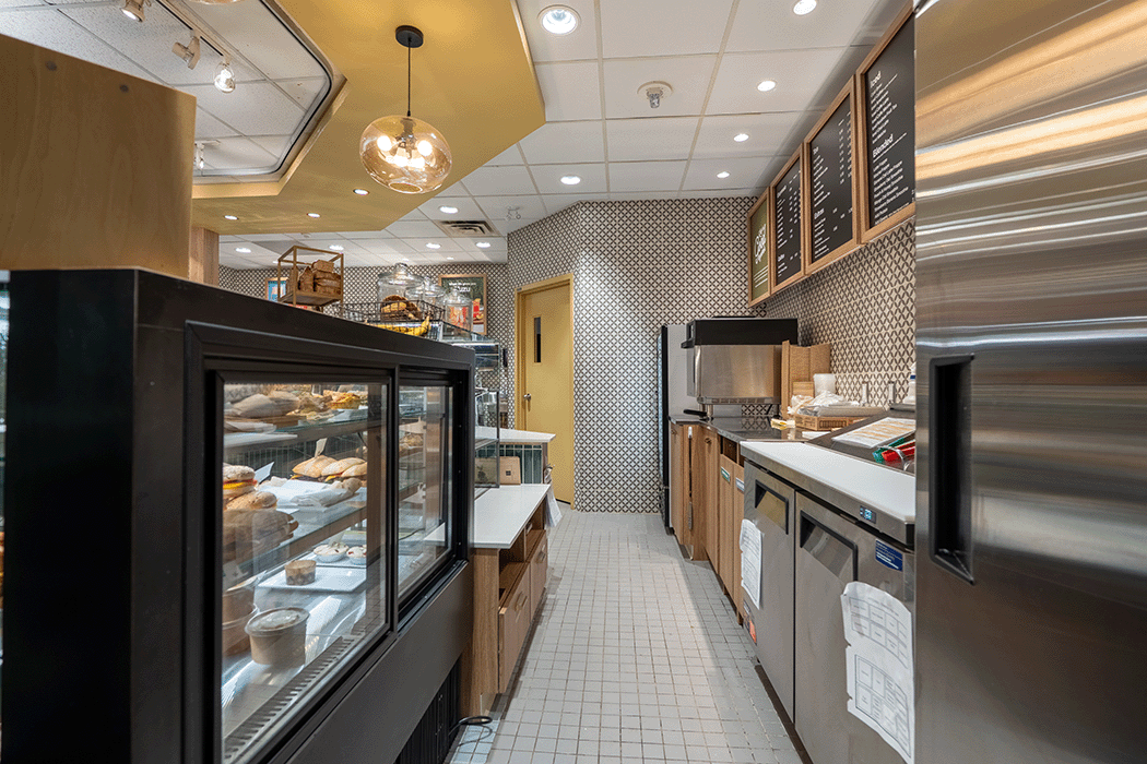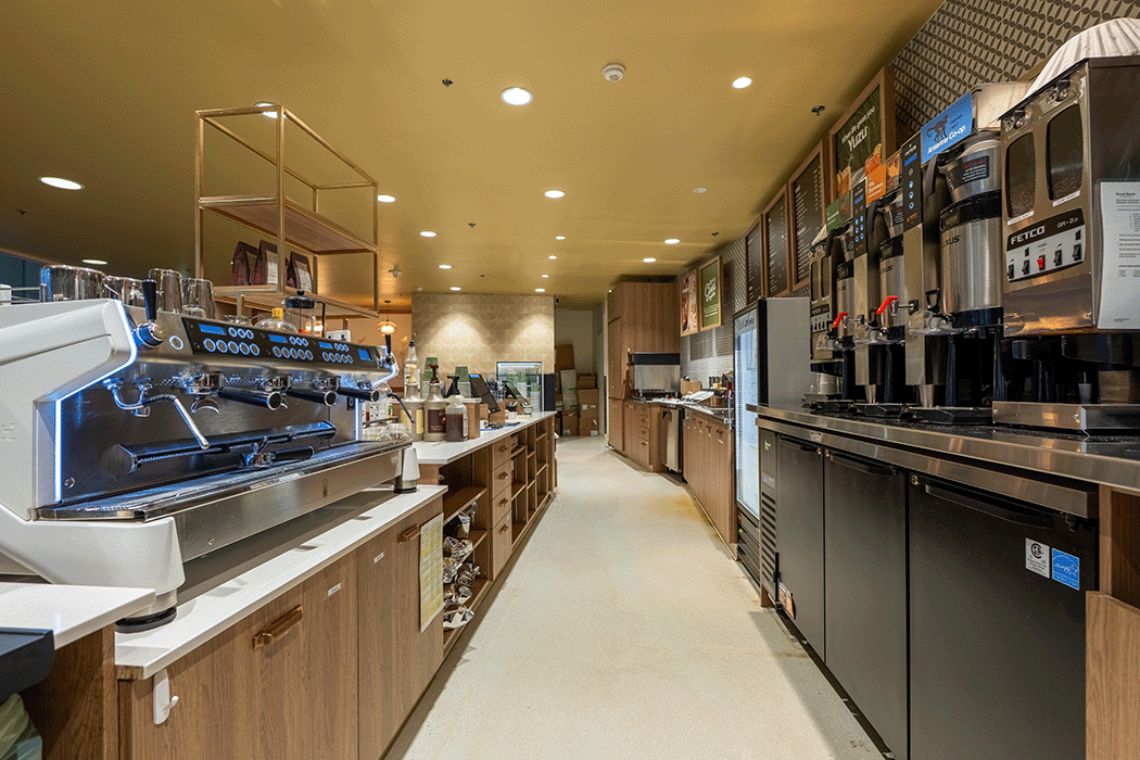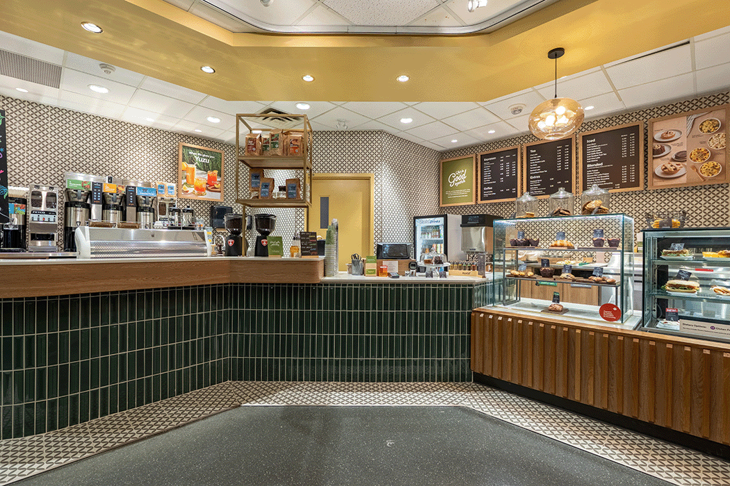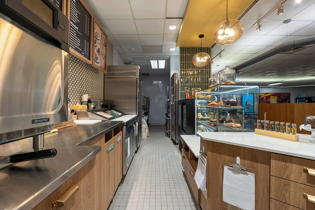 Interior renovations for a new quick serve cafe, with all new finishes, millwork, solid surface countertops, electrical, mechanical, HVAC, plumbing.