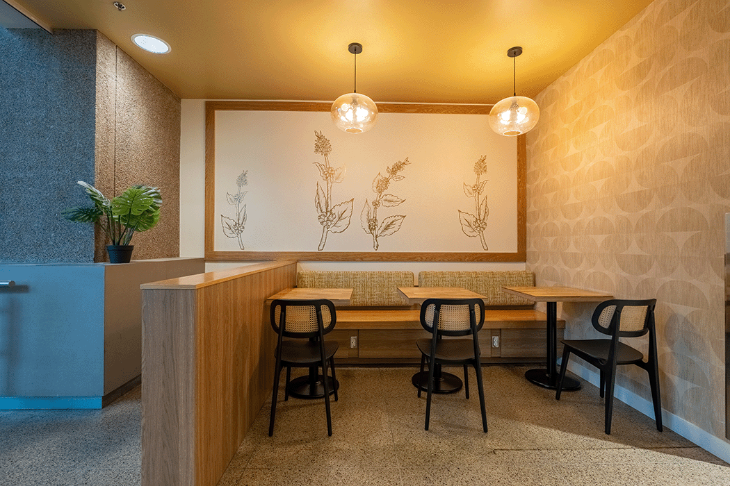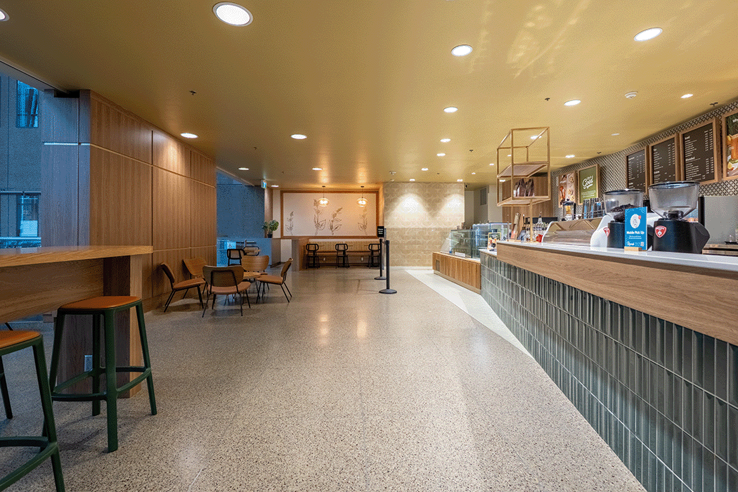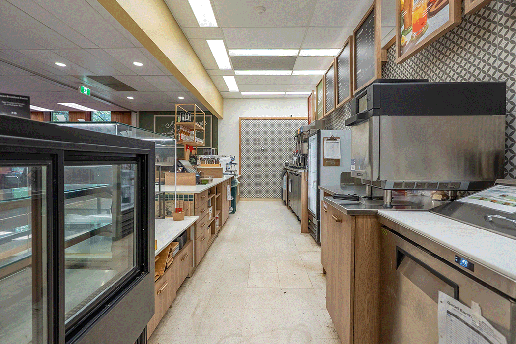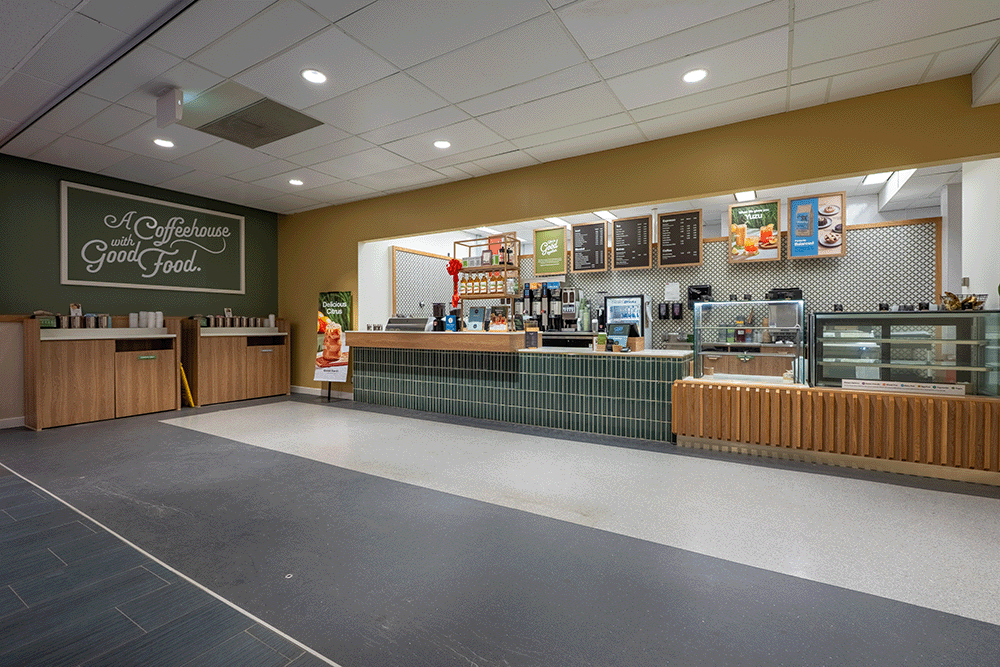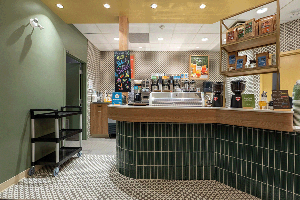 Interior renovations for a new quick serve cafe, with all new finishes, millwork, solid surface countertops, electrical, mechanical, HVAC, plumbing.